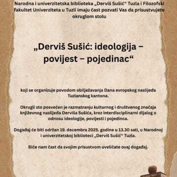 18/12/2025Narodna i univerzitetska biblioteka „Derviš Sušić" Tuzla i Filozofski fakultet Univerziteta u Tuzli imaju čast pozvati Vas da prisustvujete okruglom stolu ,,Derviš Sušić: ideologija -povijest - pajedinac" koji se organizuje…
