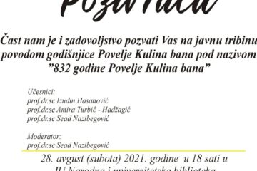 25/08/2021Čast nam je i zadovoljstvo pozvati Vas na javnu tribinu povodom godišnjice Povelje Kulina bana pod nazivom "832 godine Povelje Kulina bana". Vidimo se u subotu, 28. avgusta 2021. godine…