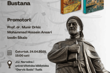 22/04/2025Poštovani, pozivamo vas da prisustvujete promociji prevoda Sadijevog Đulistana i Bustana koja će se održati u četvrtak, 24.04. sa početkom u 15:00 sati u Narodnoj i univerzitetskoj biblioteci “Derviš Sušić” Tuzla.…