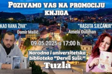 07/05/2025Poštovani, pozivamo Vas na promociju knjiga: “Kao rana živa”, autora Damira Mašića i “Rasuta sjećanja”, autorice Amele Đuliman. Promocija knjiga će se održati u Narodnoj i univerzitetskoj biblioteci “Derviš Sušić”…