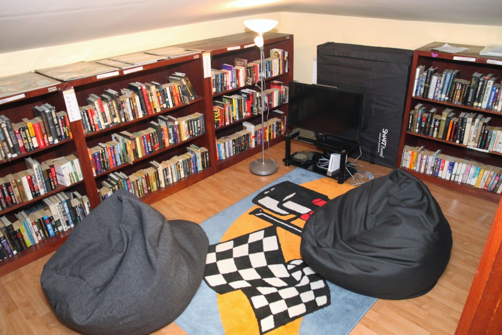 Kutak raspolaže sa 160 m2 savremeno uređenog prostora i ručno izrađenim policama sa 3.000. knjiga, kao i časopisima, multimedijalnim enciklopedijama, CD-ovima, DVD-ovima i video kasetama.