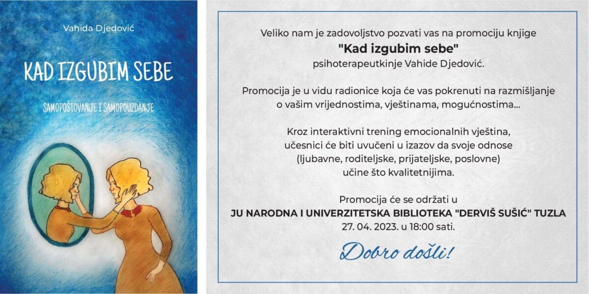 Read MoreU Narodnoj i univerzitetskoj biblioteci “Derviš Sušić” Tuzla, upriličena je promocija knjige “Kad izgubim sebe”, četvrta knjiga psihoterapeutkinje Vahide Djedović, a treća promovisana u ovoj Biblioteci. Na početku promocije prisutnima se obratila direktorica Biblioteke Mirna Trifković, koja je pozdravila prisutne i istakla da ovo nije knjiga koja će se pročitati jednom i ostaviti na policu. […]