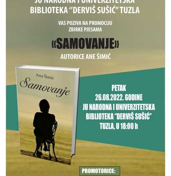 Read MoreJU Narodna i univerzitetska biblioteka “Derviš Sušić” Tuzla Vas poziva na promociju zbirke pjesama “Samovanje” autorice Ane Šimić. Petak, 26.08.2022. godine, JU Narodna i univerzitetska biblioteka “Derviš Sušić”Tuzla, u 18:00 h Promotorice: mr.sc Indira Durmić Pekarić, prof. mr. sc Enisa Žunić