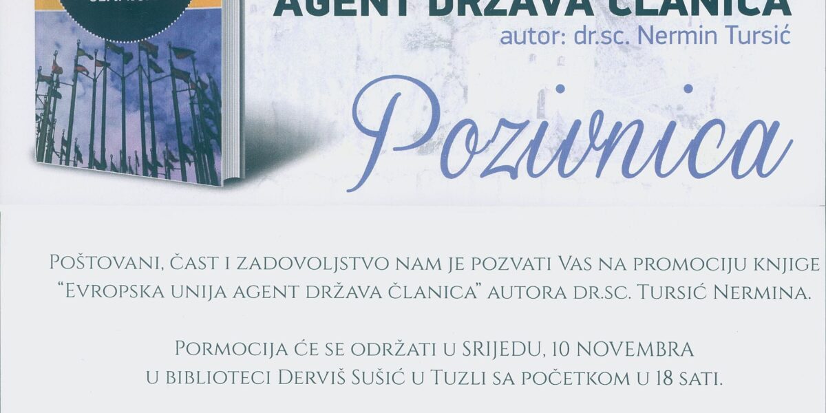 Čast nam je i zadovoljstvo pozvati vas na promociju knjige “Evropska Unija agent država članica” autora dr.sc. Nermina Tursića. Promocija će se održati u srijedu, 10. novembra 2021. godine u NUB “Derviš Sušić” Tuzla sa početkom u 18 sati. Promotori knjige: prof.dr. Omer Ibrahimagić, akademik prof.dr. Edin Mutapčić i mr.sc. Jasna Hadžiselimović Dobrodošli!