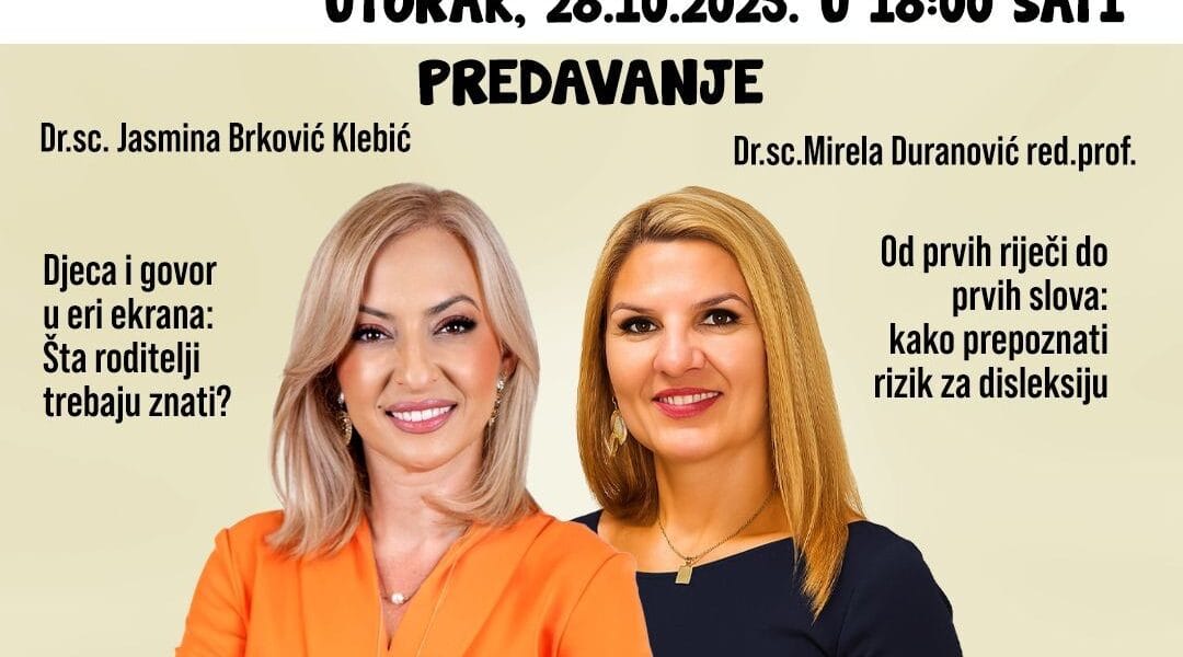 Read MoreU okviru “Mjeseca knjige” u utorak 28.oktobra 2025. godine u 18 sati u našoj Biblioteci održati će se stručno i inspirativno predavanje o razvoju dječijeg govora i jezika u savremenom dobu. Predavači: dr. sc. Jasmina Brković Klebić, logoped, govorit će na temu: „Djeca i govor u eri ekrana: Šta roditelji trebaju znati?“ dr. sc. Mirela […]