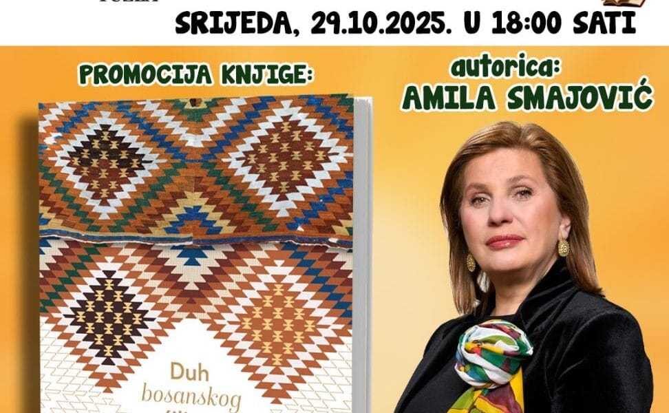 Read MoreU okviru “Mjeseca knjige” u Biblioteci “Derviš Sušić” Tuzla u srijedu 29.oktobra u 18 sati održati će se promocija knjige “Duh bosanskog ćilima”, autorice Amile Smajlović. Knjiga “Duh bosanskog ćilima” autorice Amile Smajović predstavlja prvo djelo koje istražuje bosanski ćilim kroz likovne, komunikološke i geometrijske aspekte. Ova opsežna studija nas vodi u svijet simbola i […]