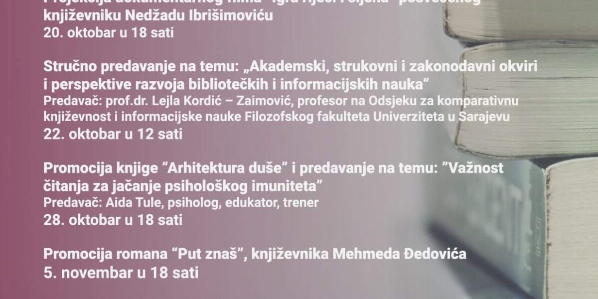 Read MorePredavanje u okviru manifestacije “Mjesec knjige” zakazano danas tj. četvrtak 22.oktobra u 12 sati u prostorijama Biblioteke na temu: “Akademski,strukovni i zakonodavni okviri i perspektive razvoja bibliotečkih i informacijskih nauka u Bosni i Hercegovini”, prof.dr. Lejle Kodrić-Zaimović, odgađa se zbog opravdanih razloga predavača.