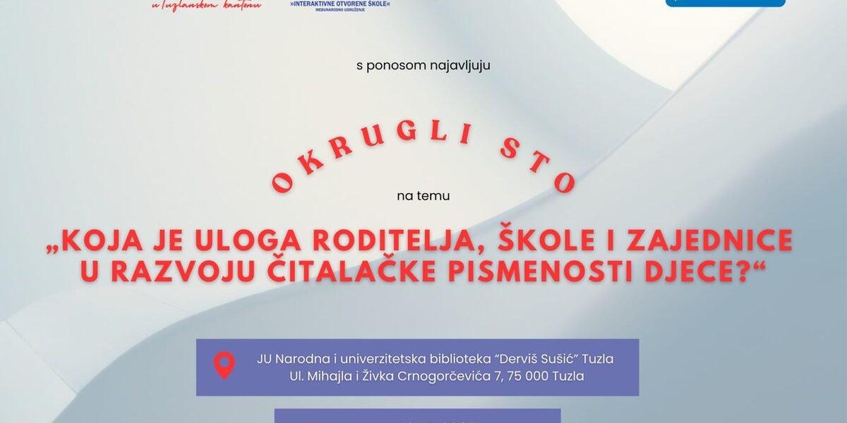 Read MorePoštovani/a, Čast nam je pozvati Vas na okrugli sto na temu: „Koja je uloga roditelja, škole i zajednice u razvoju čitalačke pismenosti djece?” koji organizira Međunarodno udruženje „Interaktivne otvorene škole“ Tuzla i JU Narodna i univerzitetska biblioteka Tuzla u saradnji i uz podršku Ministarstva za kulturu, sport i mlade Tuzlanskog kantona, a koji se organizuje […]