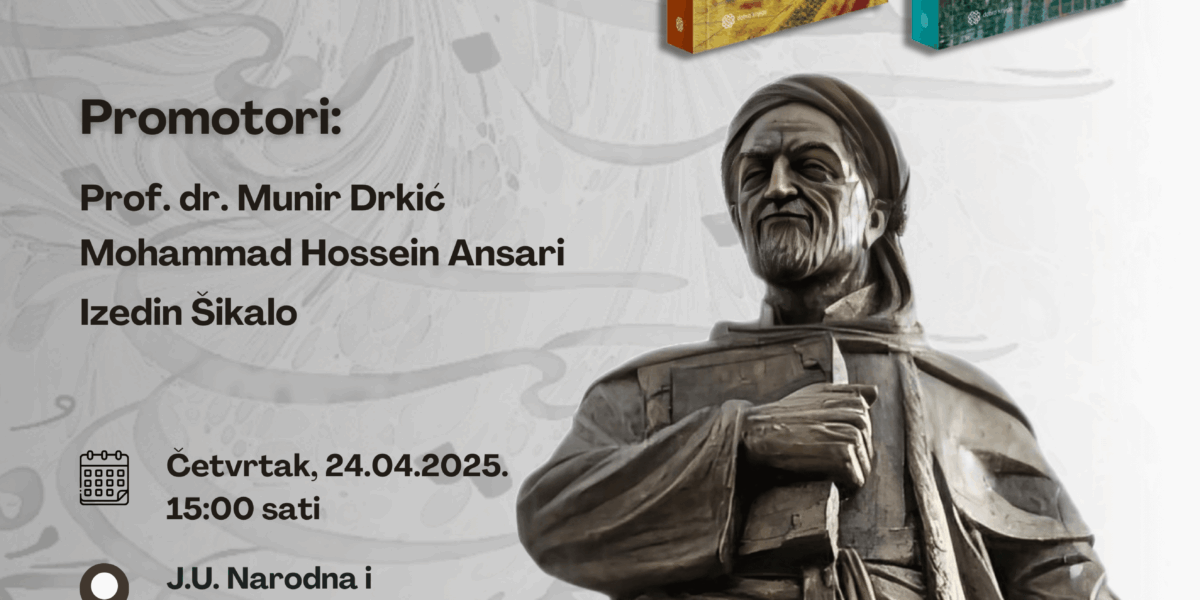 Read MorePoštovani, pozivamo vas da prisustvujete promociji prevoda Sadijevog Đulistana i Bustana koja će se održati u četvrtak, 24.04. sa početkom u 15:00 sati u Narodnoj i univerzitetskoj biblioteci “Derviš Sušić” Tuzla. Promocija je organizirana u saradnji Kulturnog centra Ambasade IR Iran i Narodne i univerzitetske biblioteke “Derviš Sušić” u Tuzli povodom obilježavanja Dana Sadija Širazija, koji […]