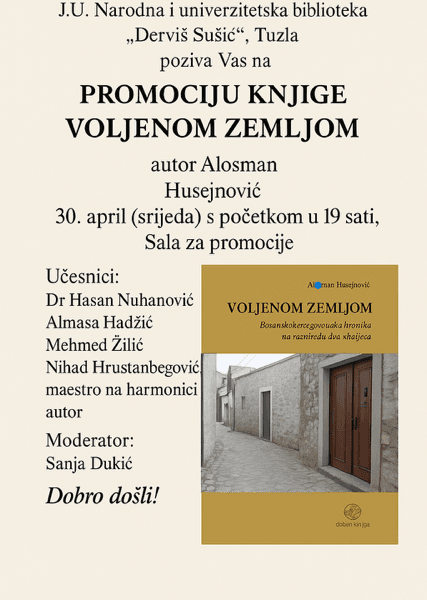 Read MoreU srijedu 30. aprila u 19 sati u JU Narodna i univerzitetska biblioteka „Derviš Sušić“ Tuzla održati će se promocija knjige „Voljenom zemljom“ autora Alosmana Husejnovića. Na promociji će govoriti: Hasan Nuhanović Almasa Hadžić Mehmed Žilić Nihad Hrustanbegović Sanja Dukić, moderator O autoru Alosman Husejnović, novinar i publicista iz Tuzle, ratni izvještač Ljiljana, poratni […]