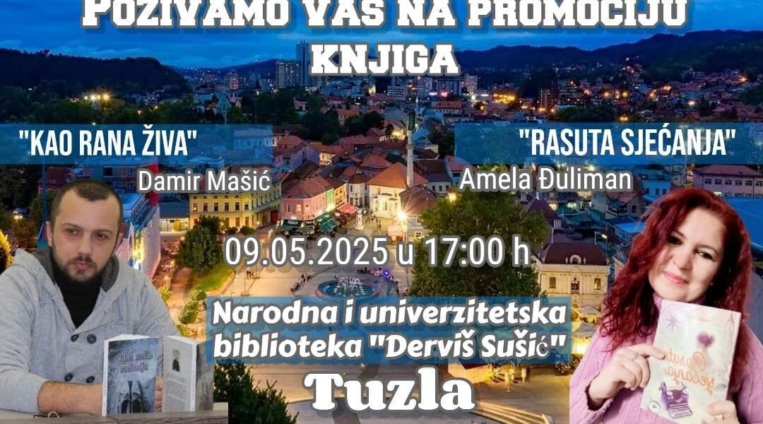 Poštovani, pozivamo Vas na promociju knjiga: “Kao rana živa”, autora Damira Mašića i “Rasuta sjećanja”, autorice Amele Đuliman. Promocija knjiga će se održati u Narodnoj i univerzitetskoj biblioteci “Derviš Sušić” u petak 9.5.2025. godine sa početkom u 17:00 sati. Dobro nam došli!