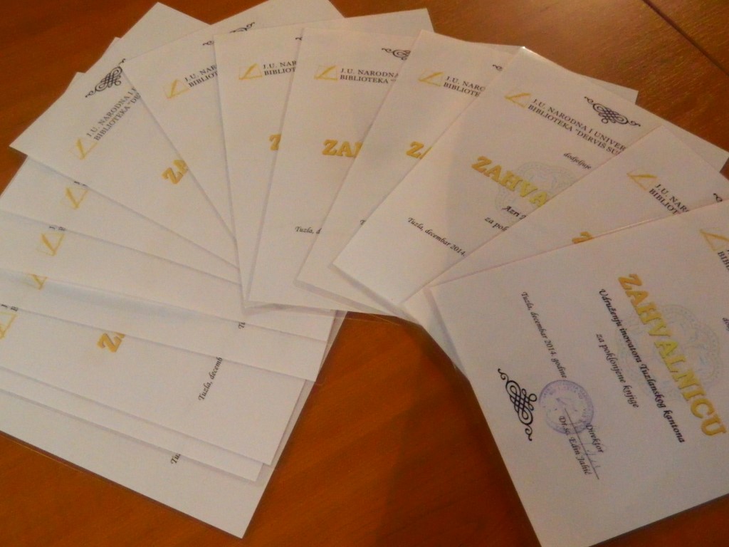 Danas je u prostorijama tuzlanske biblioteke „Derviš Sušić” upriličena tradicionalna dodjela zahvalnica građanima koji su u toku 2014. godine poklonili Biblioteci knjige. O broju i vrijednosti poklonjenih knjiga u protekloj godini govorila je Maksida Sijerčić, bibliotekar u Službi za nabavku bibliotečke građe, a direktor Biblioteke dr.sc. Edin Jahić uručio je donatorima zahvalnice.