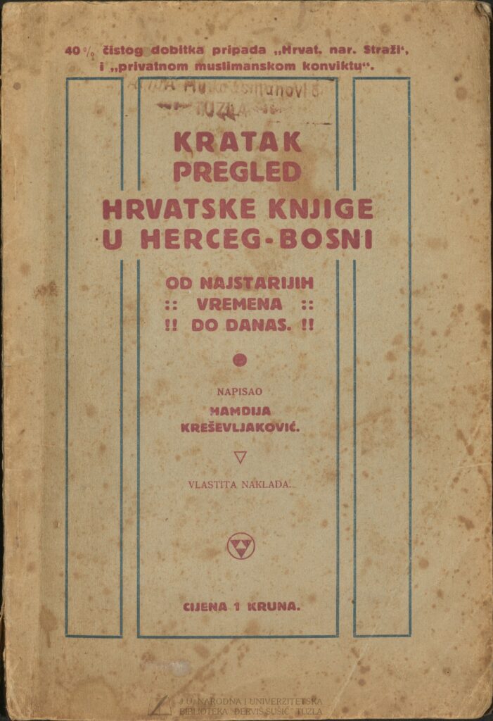 | Naslov | Kratak pregled hrvatske knjige u Herceg-Bosni od najstarijih vremena do danas / sastavio Hamdija Kreševljaković |
