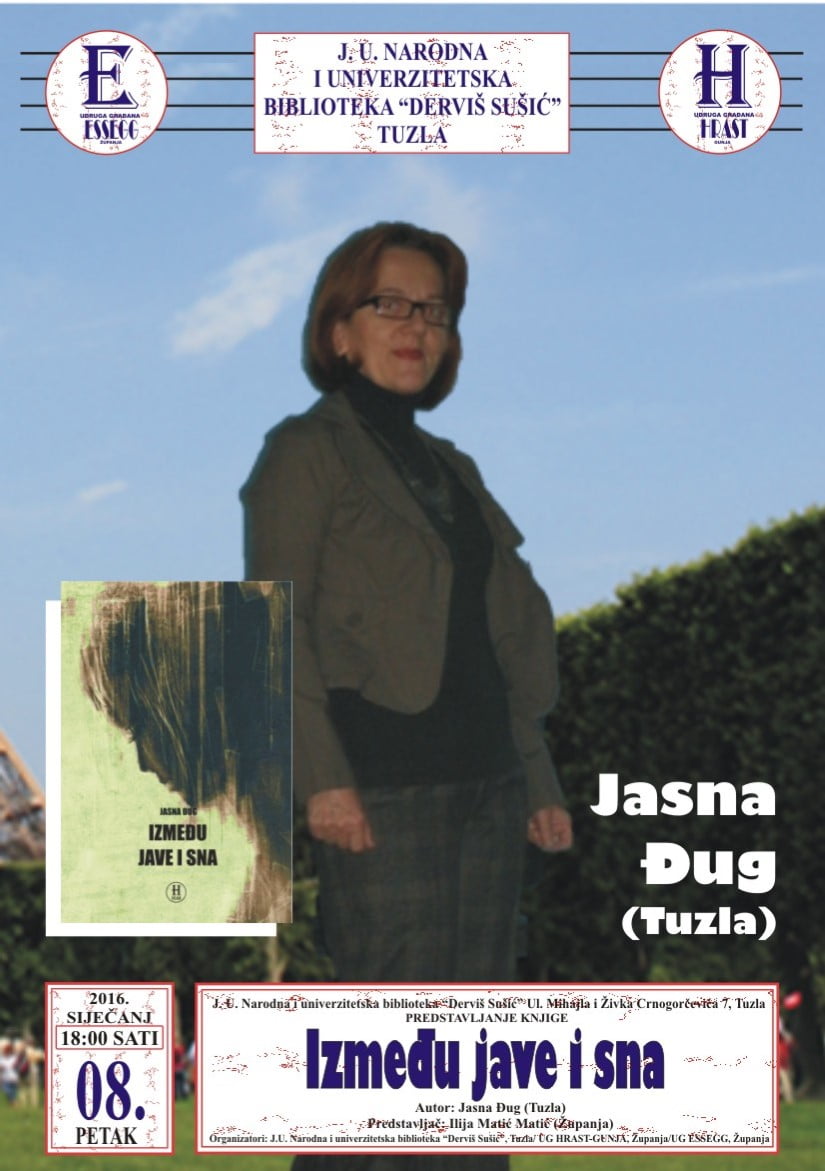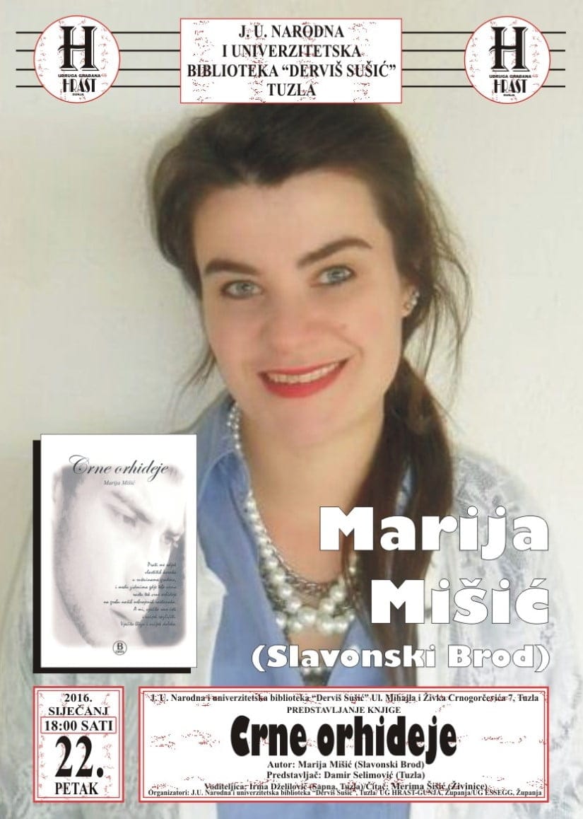 Književna tribina na kojoj će biti predstavljene knjige „Vesela družina“, autor Mirela Salković (Tuzla), „Između jave i sna“, autorice Jasne Đug (Tuzla) i Marije Mišić (Slavonski brod) „Crne orhideje“ održat će se u u petak 22.januara 2016.godine od 18 sati u Biblioteci “Derviš Sušić” Tuzla.