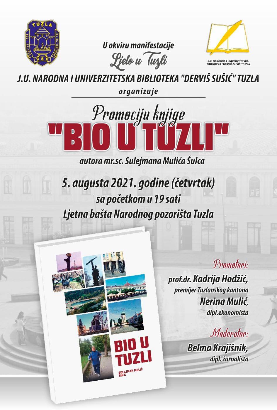 U okviru manifestacije “Ljeto u Tuzli” Biblioteka organizira promociju prve knjige Sulejmana Mulića Šulca “Bio u Tuzli”, u četvrtak 5.augusta 2021. godine sa početkom u 19 sati u ljetnjoj bašti Narodnog pozorišta Tuzla.