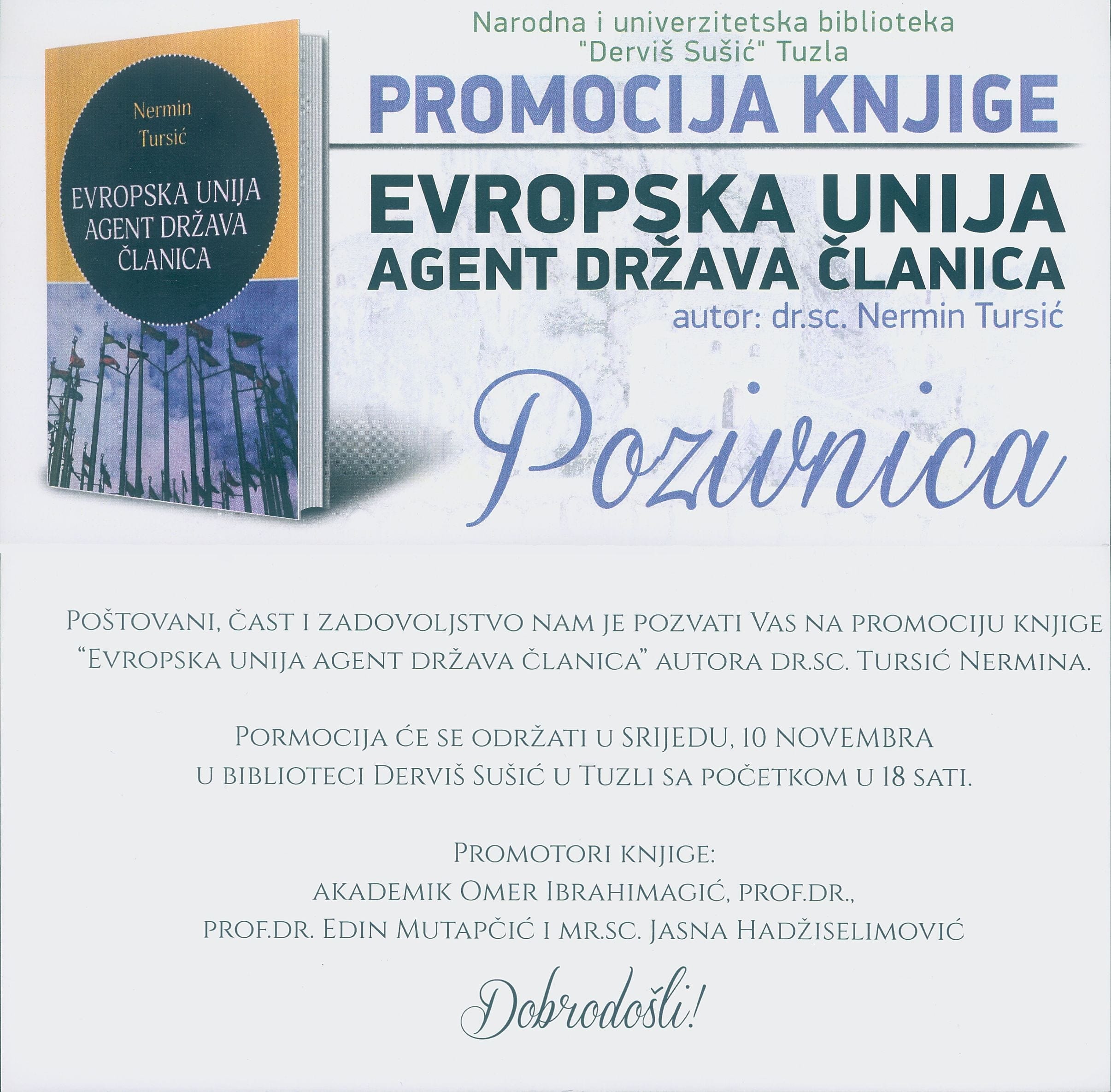 Čast nam je i zadovoljstvo pozvati vas na promociju knjige “Evropska Unija agent država članica” autora dr.sc. Nermina Tursića.