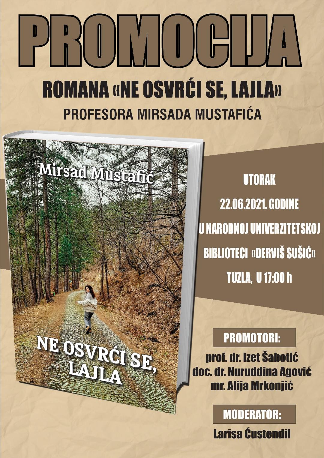 Promocija knjige “Ne osvrći se Lajla” održati će se u Tuzlanskoj biblioteci “Derviš Sušić” u utorak 22. juna u 17 sati. O knjizi će govoriti: prof.dr. Izet Šabotić, doc.dr. Nuruddina Agović, mr.Alija Mrkonjić i moderatorica prof.Larisa Ćustendil.