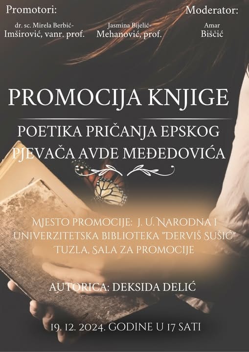 Promocija knjige „Poetika pričanja epskog pjevača Avde Međedovića“, autorice Dekside Delić održati će se u četvrtak 19.12.2024.godine u 17 sati u sali Biblioteke „Derviš Sušić“ Tuzla.
