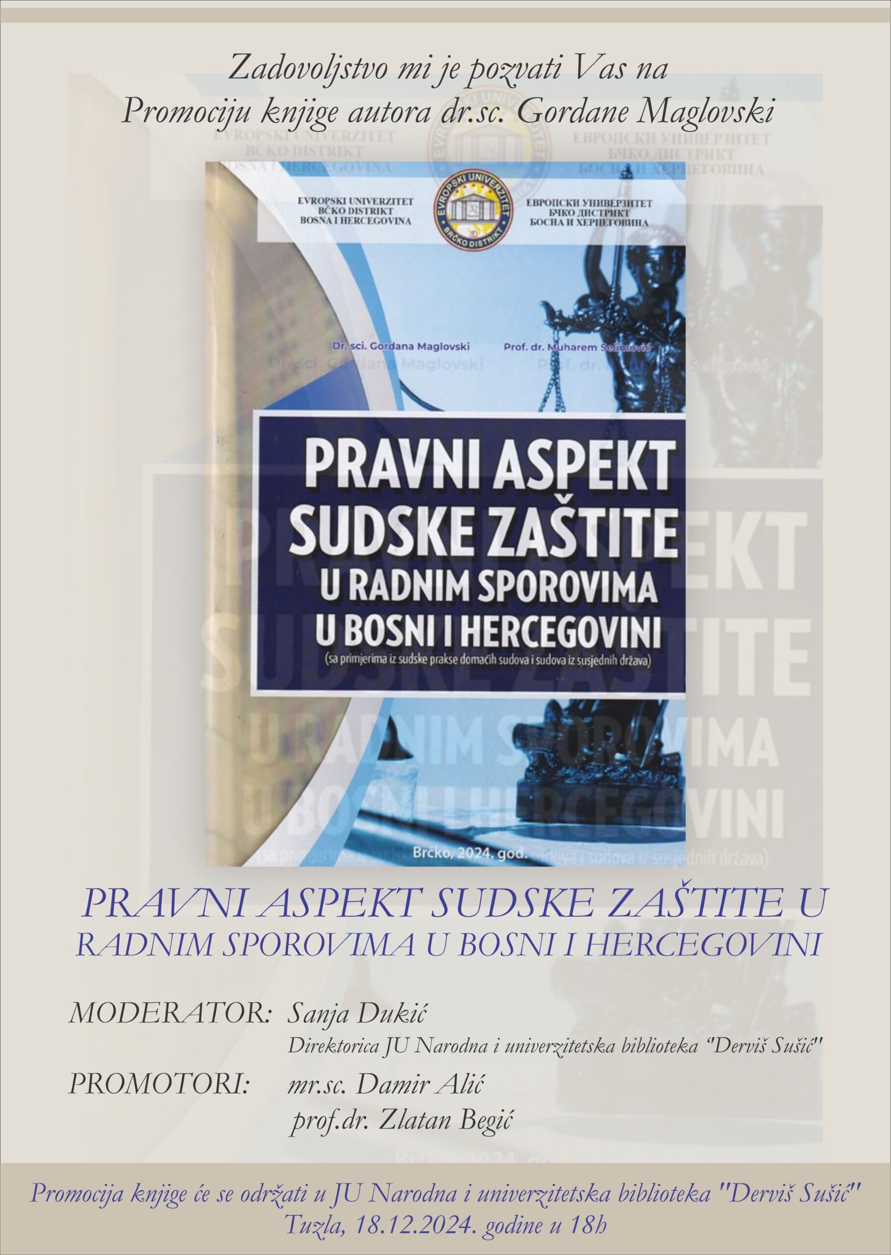 Promocija knjige „Pravni aspekt sudske zaštite u radnim sporovima u BiH“ autorice dr.sc. Gordane Maglovski održati će se u srijedu 18.decembra 2024.godine u 18 sati u sali Biblioteke.