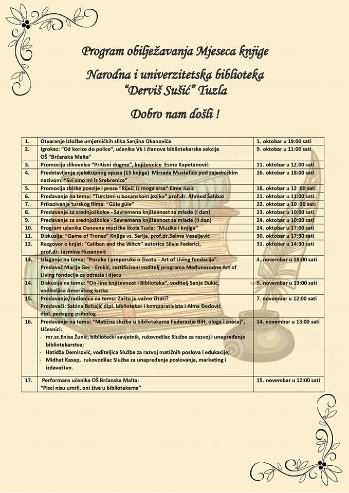 Na otvorenju izložbe predstavnici Biblioteke najavili su bogat repertoar predstojećeg “Mjesec knjige” i pozvali ljubitelje umjetnosti i lijepe pisane riječi da prisustvuju predstojećim događajima u Biblioteci.